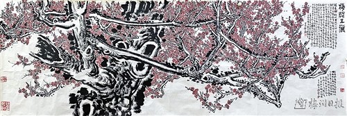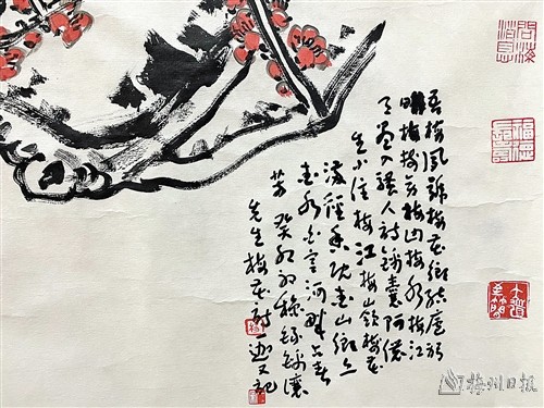 兴之所至,任遣笔端。杨一家老师花了一周时间,为这次风眠故里之行专门创作了三幅精作:一是丈二规格的大画《岭上凤鸣图》(图一),此画大气磅礴,开合有度,将风眠故里阁公岭村的田园风貌、白宫河、茶楼、民居以及明山桃坪一带的高山茶田尽收眼底,画作命名亦尽巧思,取林风眠早年在家乡的学名“凤鸣”,又取阁公岭村之“岭上”入题,可谓情真而意切;二是以梅州市花为题材的八尺规格的《梅开五福图》(图二),作者笔下所写为千年宋梅,铁干虬枝,凌寒傲霜,独占群芳。一枝一叶,一花一蕊,无不象征着“梅花香自苦寒来”的客家人精神。三是杨老师还以白宫明山一带的壮美山水为原型,创作了四尺规格的《凤鸣九天图》(图三)。