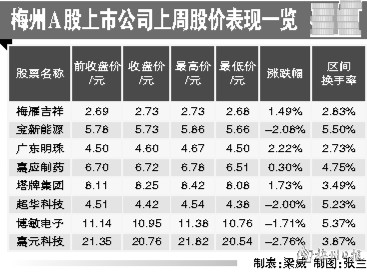 梅州8家A股上市公司上周股价表现为4家上涨4家下跌,涨跌各半。