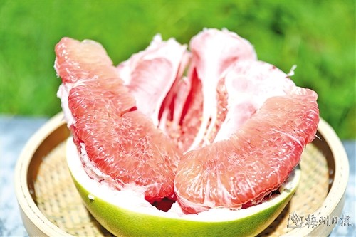 另一边,在高陂镇的梅州杉富生态农业发展有限公司,三红蜜柚种植基地的蜜柚同样迎来了丰收季。该基地种植有蜜柚1200多亩,总产量达150万斤。“今年糖度提升很快,目前检测的情况来看,糖度能达12.6。”该公司总经理吴演武随手摘下一个柚子,扯去海绵状的外皮,红色的果肉便露了出来,粒粒分明的果肉晶莹剔透,十分诱人。