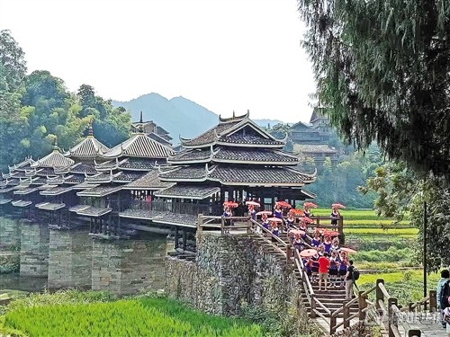 这是一个千年古寨,有着丰厚的侗族文化底蕴和奇特的自然山水风光。景区内溪流纵横,造就了众多的风雨桥、亭、台、楼阁、门廊以及侗寨吊脚楼等丰富的建筑元素。特别是“永济风雨桥”,它是目前保存最好、规模最大的风雨桥。它似桥似亭,桥身使用大小不等的杉木榫衔接,未用一钉一铆,屹立于村中河上。桥长78米、宽3.8米,桥面高11.5米,5座桥亭建于墩台之上,与19间桥廊和谐连为一体,浑然天成,大气恢宏。据介绍,此桥以其高超的木石结构建筑技艺闻名,与我国的赵州石拱桥、泸定铁索桥、罗马尼亚的诺娃沃钢架桥一同被誉为“世界四大历史名桥”;2007年还被美国国家广播公司评为世界十大最壮观桥梁。