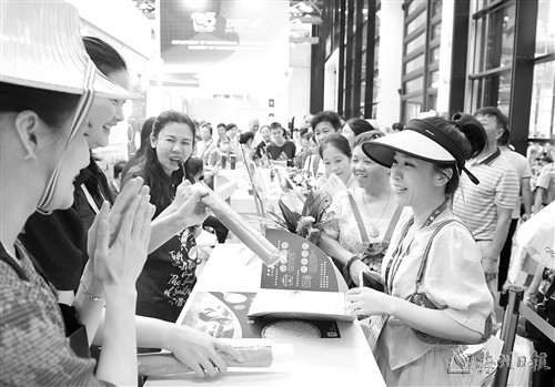 9月19日,在东博会泰国商品馆,观众在排队参加关于泰国商品的有奖问答。
