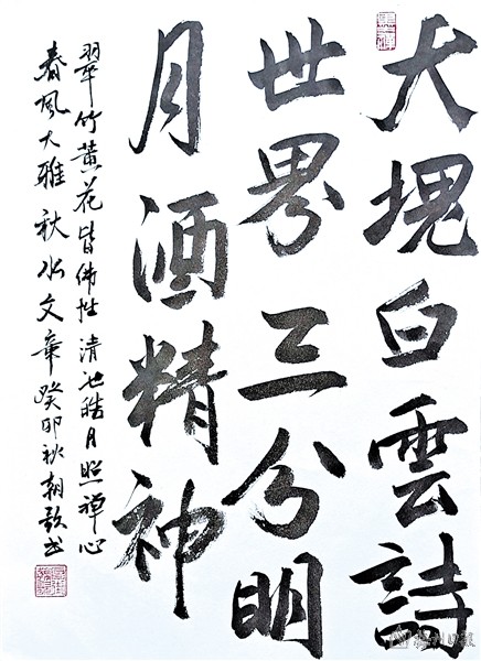 原玉 □李小星 又是天高云淡时,梧桐叶落惹相思。 庭前赏菊吟清韵,水上横舟荡碧漪。 曲径栽花环古道,兰亭煮酒赋新诗。 听风琢玉怡情趣,柳岸流连只怨痴。 其一 □刘碧青 正是秋声萧瑟时,枫红菊艳惹遐思。 梧桐落叶情深恋,翠竹摇枝荡绿漪。 树上寒蝉鸣小曲,长空大雁唱新诗。 听风眺望丰收景,柳岸欢欣又醉痴。 其二 □曾汉权 又值丹霞染墨时,蝉鸣高树引幽思。 荷风浩荡千层锦,桐雨缠绵八尺漪。 漫步韶光欣择韵,舒怀岁月畅吟诗。 倾城美景浑添画,心恋秋芳作赋痴。 其三 □张展西 北国轻寒始袭时,丹枫染色惹情思。 陶园菊绽狂蜂引,渚泽舟横浅浪漪。 垄上高粱欢抢割,亭前老叟乐题诗。 听风仿佛琴声奏,柳岸逸闲垂钓痴。 其四 □黄尚欣 又是枫红菊艳时,既无雁信也无思。 云山万里留残梦,秋水一泓凝绿漪。 踏月放怀须饮酒,登高遣兴莫吟诗 岂堪回首相逢处,不见当年那片痴。 | |