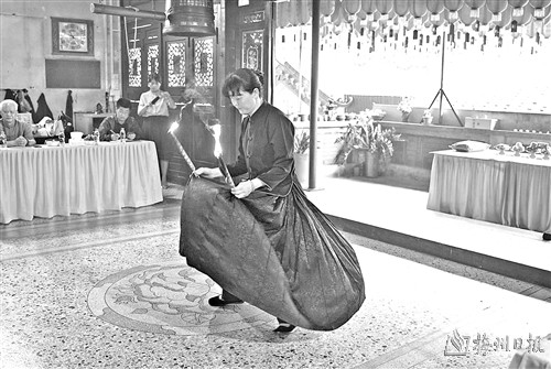 据介绍,三圣宫的师父在民国初年,由当时的师太林蕴珍学习了香花佛事和开光舞蹈,传承给师公魏锦芳师父,再传给现在的住持生元师父,由她传承给利佳裕、黄如玉、彭叶娣、黄菱、杨红菊、陈巧卿、曾思梅、李翠玲、罗苑红、张秋苑等10多位徒弟。