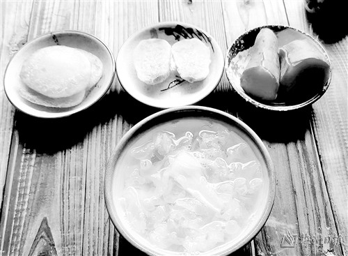 也可以是几块野姜花煎饼、一根蒸红薯一个芋仔(在菜园子里挖到的)、一碗银耳甜汤。