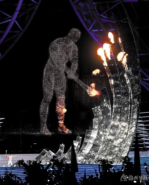 第一棒火炬手叶诗文高擎亚运火炬入场,樊振东、徐梦桃、石智勇、李玲蔚、汪顺5名火炬手接力奔跑,他们都曾在国际体育舞台取得骄人成绩。场外,光影汇聚而成的“数字火炬手”出现在杭城夜空。