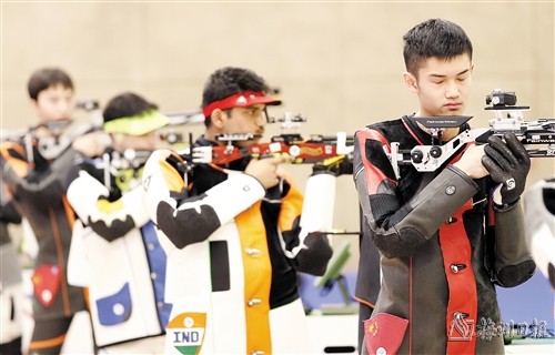 9月25日,中国选手盛李豪(右一)在比赛中。他以253.3环打破世界纪录的成绩夺冠。