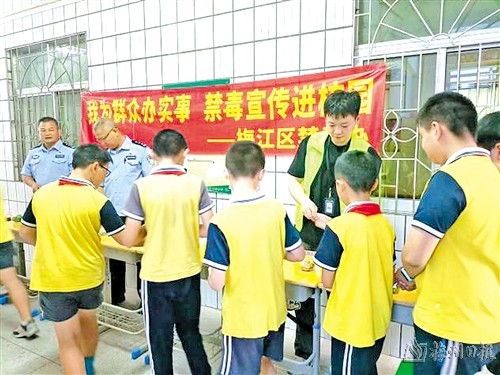 本报讯 (记者廖玉芳)为进一步增强青少年识毒、防毒、拒毒的意识,全面做好青少年毒品预防教育工作,9月15日下午,梅州市公安局梅江分局、梅江区禁毒办联合梅江区教育局在梅江区西街小学组织开展了“开学第一课”禁毒宣传进校园活动(如上图)。