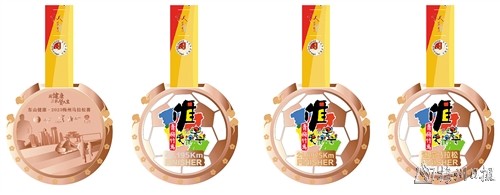 本届赛事完赛纪念奖牌正面设计主要运用土楼、高铁梅州西站,梅花、祥云等元素,以及运动健将们跑过梅州美丽风景,用心体验梅州地标的场景,象征着全民健身运动在梅州蓬勃发展。奖牌的反面设计以原创彩书汉字艺术为元素,客家文字“亻厓”为内涵,结合传统书法题写的“青梅竹马”主题和彩书“众乐乐”,设计出一个有地域特征、主题内容、国学经典和视觉效果的独特梅马标识。