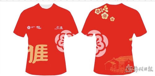 参赛服整体采用大红色为主色调,将梅州及客家元素有机融合,利用造型变化及颜色变换将梅花的两种形态与赛服融合,充分把梅州马拉松的精神和梅州精神展示出来,并在正面及侧面的位置,将客家文字“亻厓”嵌入赛服,体现出“亻厓系客家人”的主体定位,展现梅州人民的好客之情。