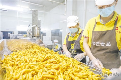 中秋、国庆黄金周临近,走进客迁食品有限公司的丙村加工厂,映入眼帘的是工人们忙碌的身影,经过清洗、腌制、熟制、放凉、真空包装、灭菌、外包等工序,盐焗鸡等客家特色美食新鲜出炉,准备运往全国各地。客迁食品总经理温海经告诉记者,公司自2013年成立以来,创新研制了盐焗食品、木捶肉丸、腊味等系列食品,在广东、江西、湖南等地十分畅销。“企业年销售额约4000多万元,我们通过实体门店、经销商、网络直播等渠道推广销售,销量最高的一场直播卖出4万多包盐焗食品。”温海经说,在丙村镇支持下,企业已发展成为梅州地区同行业的佼佼者,企业将不断更新生产线,扩大产能提升质效,让更多游子和食客品尝地道的“梅州味”。