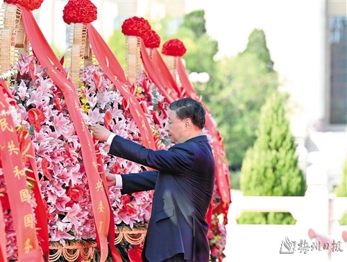 习近平迈步上前,仔细整理花篮缎带。随后,习近平等党和国家领导人缓步绕行,瞻仰人民英雄纪念碑。