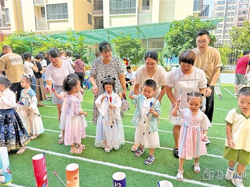 日前,为弘扬中华民族优秀传统文化,正本大地幼儿园开展了庆中秋亲子游园活动。只见萌娃们穿上了精致的汉服,在游园会上体验猜灯谜、投壶、套圈、做香包、画团扇等活动,还品尝了桂花酿团子、月饼、柚子等美食,玩得不亦乐乎。
