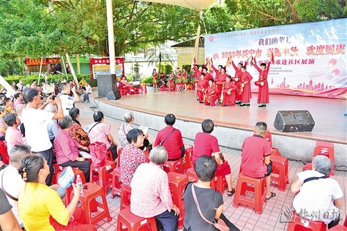 9月24日,由兴宁市文化馆指导,兴宁市竹板歌山歌非遗传承队承办的“我们的节日”2023年兴宁市喜迎中秋、欢度国庆竹板歌客家山歌进社区文艺活动在杨如彭山歌亭举行。通俗易懂的即兴山歌、精彩搞笑的小品、动感的广场舞、动听的合唱等18个节目相继上演,现场掌声、喝彩声此起彼伏。