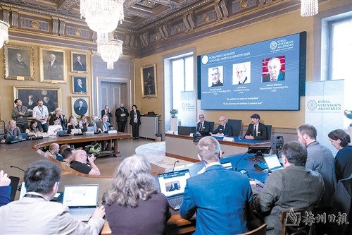 瑞典皇家科学院4日宣布,将2023年诺贝尔化学奖授予蒙吉·巴文迪、路易斯·布鲁斯和阿列克谢·叶基莫夫,以表彰他们在发现和合成量子点方面所作出的贡献。(新华社发)