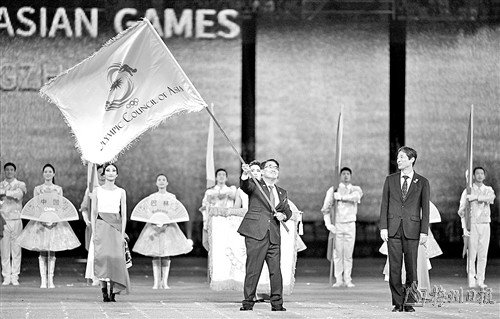 伴着亚奥理事会会歌,亚奥理事会会旗缓缓降下。