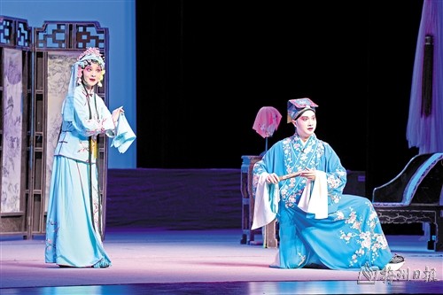 “陈彩凤偷出闺门展翅飞,海阔天空任翱翔”“谢大人赠彩灯赐我恩光”……当婉转缠绵的唱腔响起,一出讲述岭南羊城员外陈聪欲将其女嫁与显贵,特聘穷秀才王大儒施教,以求其女成为“闺范”,不料其女彩凤竟冲破封建礼教约束,与王大儒情投意合,两人经一番波折终成夫妻的故事跃然舞台(如左图,广东汉剧传承研究院供图),剧情喜庆诙谐,饶有情趣,引发观众阵阵欢笑声。