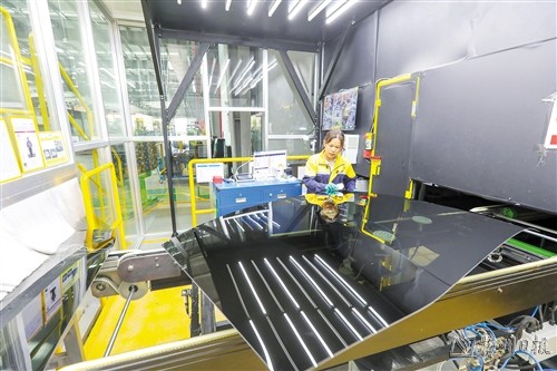 走进广梅产业园的梅州圣戈班高端汽车玻璃生产车间内,只见机器高速运转,机械手臂在有条不紊操作,工人开着叉车来回运输成品,呈现出一派火热景象。