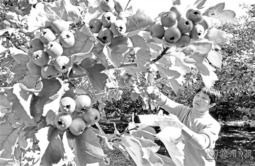 10月9日,河北省晋州市马于镇西贾庄村的农民在果园采摘山楂。
