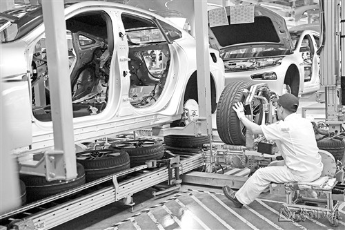 10月9日,工作人员在广东肇庆小鹏汽车智能网联科技产业园内的总装生产线上工作。