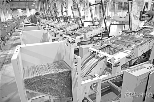 10月9日,在广东广宁县一家竹制品厂,工作人员维护竹签自动化生产设备。