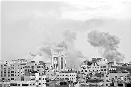 上图为10月9日,加沙城的建筑遭以色列空袭后升起浓烟。