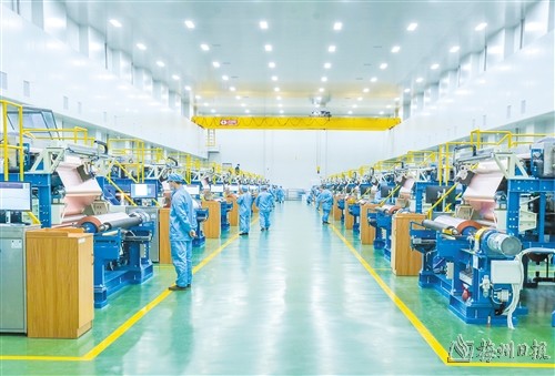 国庆假期过后,记者走进位于梅县区城东镇的嘉元时代年产10万吨铜箔首期项目现场看到,3号、4号厂房已经拔地而起,在生箔车间,4条崭新的生产线全速运转,4.5微米极薄金色铜箔从一台台生箔机中缓缓吐出。“目前项目首期年产5万吨电解铜箔项目厂房已完成建设,首批10台生产设备已完成安装和调试,正式试产。”嘉元科技副总裁钟丹介绍道。据了解,该项目是梅州历史上单体投资最大的工业项目,计划总投资约81.28亿元,于2022年6月8日动工建设,仅用半年时间实现“拿地即开工”,创造了“梅州速度”。