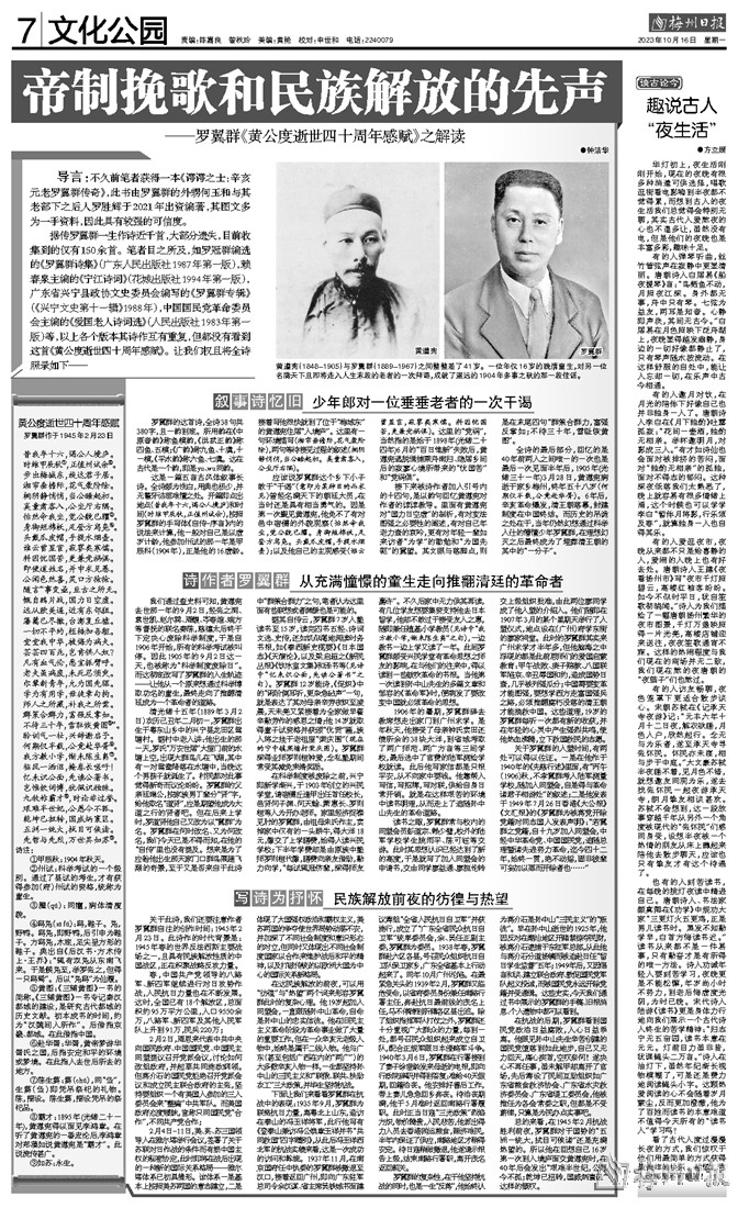 全诗的最后部分,回忆的是40年前两人之间唯一的一次也是最后一次见面半年后,1905年(光绪三十一年)3月28日,黄遵宪病逝于家乡梅州,终年五十八岁(何期仅半载,公竟赴华胥)。6年后,辛亥革命爆发,清王朝落幕,封建制度在中国终结。而历史的吊诡之处在于,当年仍然幻想通过科举入仕的懵懂少年罗翼群,在理想幻灭之后最终成为了埋葬清王朝的其中的“一分子”。