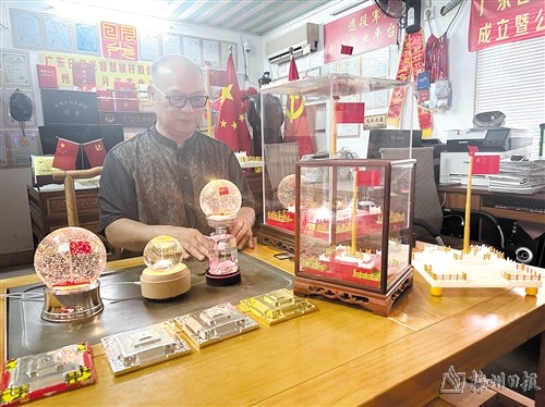 “这是目前试生产出的水晶球、磁悬浮、木雕等‘智慧旗杆·座’摆件,其可变光、变色,还可通过APP操作播放音乐。”日前,田明光向记者展示了他精心研究制作的系列科技文创产品。记者看到,从国旗到旗杆再到旗座,都是严格按照标准等比例缩小,富有美感且适用范围非常广泛。田明光介绍说,产品可采用金属、木材、塑胶等材料进行个性化定制,可作为摆件,以此为载体加强爱国主义教育。