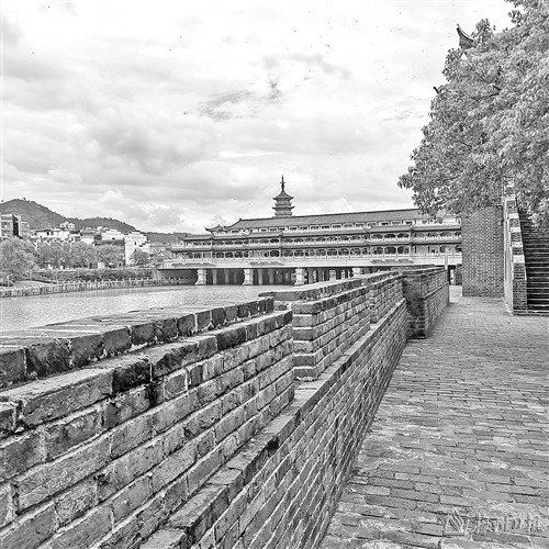 “闽粤通衢”门楼又叫“镇武楼”,是一座造型独特的城楼,为城垣外廓,是镇守石城北关的重要防御设施,因此又被称为“敌楼”“箭楼”。城门上建阁楼,为穿斗式梁架木结构,歇山顶。镇武楼所处郭头街兴于南宋绍兴年间,长约 2.5 千米,宽2至3米,为卵石铺筑而成。自唐宋以来,这里一直是客家人南迁通往广东、福建的必经之路,南来北往的客商、车夫、挑夫等到了郭头古街都要落脚歇息。作为中原汉人南迁的实物见证和历史信息的载体,“闽粤通衢”的保存对于研究客家民系的形成、发展有着极其重要的意义。门口矗立的“闽粤通衢赋”碑,介绍了石城客家先民的迁徙历史和石城的民俗风情,看后感触良多,而对最后一段更是印象深刻:“尤感其民风淳朴,厚道热忱,入孝出弟(悌),诗礼为箴。行事于实,做人于诚,甘于清白,韧于坚贞。廉风浩荡,办喜事毋须随礼;正气绵延,讲道义咸必体仁。口碑高矗,中外蜚声,至矣哉。……”关于“办喜事毋须随礼”一事,笔者很是好奇,特意走访了周边的当地百姓,结果得以证实。心想,对于当今讲求礼尚往来的社会,这种做法实属难能可贵。