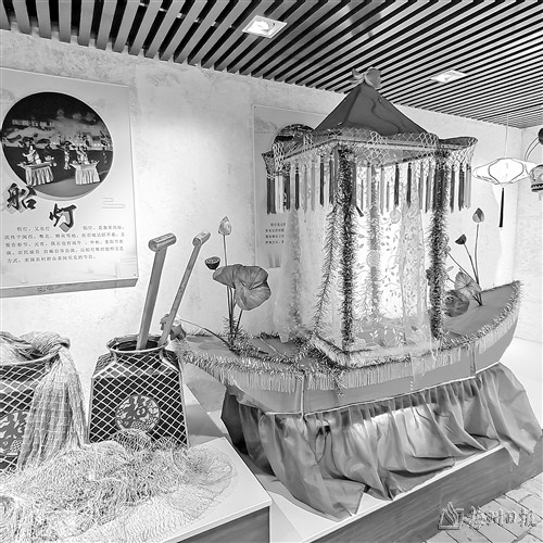 在石城期间,笔者前往参观了位于通天寨山脚下南庐屋内的彩灯馆。南庐屋是典型的赣派客家建筑,屋前有一个半圆形大池塘,这与梅州围龙屋无论从形制还是寓意都是相近的。大门的门楣上镌刻着由清代书法家吴仁题写的“南庐”二字,取自“结庐在人境”“悠然见南山”;这与梅州城区的人境庐一样,屋名意境取自陶渊明诗句,而且屋主也姓黄,难道这也是一种巧合?资料显示,该屋占地20余亩,仅屋宇现存 116 间(一说99.5间,以示主人谦逊)。屋内功能齐全,厅堂、住屋、水井、池塘、园圃、学堂、卫戍设施样样俱全,正栋两侧各有两排舍屋,相向对称,灯彩馆就在右边的舍屋(梅州称横屋)的几十个房间内。展馆的每个房间门口分别粉饰有毛主席诗词,不知是早期的年代印记还是现今的刻意表达。