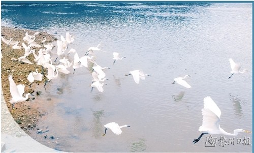 本报讯 河流碧波荡漾、远处青山环绕、成群白鹭翱翔……近期以来,在大埔县高陂镇埔田村,白鹭成群翩翩飞,与周边绿水青山构成一幅美丽的生态画卷,引得不少摄影爱好者前来拍照。