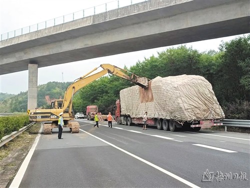 通讯员潘苏城)日前,一辆满载货物大货车由于车速过快,车辆货物发生倾斜。路政、公安交警一改传统救援方式,合理利用货车所载物品特性,调来钩机将货物“扶正”,大大缩短救援时间。