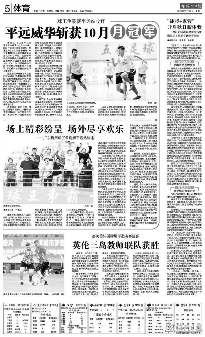 激烈拼抢、带球过人、配合拆档、妙传队友、劲射入网……10月22日晚,在平远县文体中心,为期两天的广东梅州五人足球争霸赛(球王争霸赛)平远站的赛事落下帷幕。这个周末,球场上球员奋力拼搏,场下男女老少观众齐聚,呐喊声欢呼声此起彼伏,氛围一点不亚于职业球赛。8支来自省内的草根球队在球场上的精彩表现,让球迷们大饱眼福,在“家门口”感受足球的魅力。