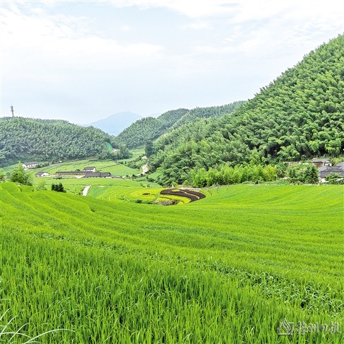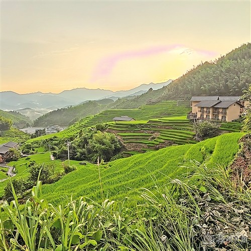 第二天一大早,带着满满的期许和梦幻般的想象,向着梯田“飞奔”。当我置身于梯田中央,感受着层层绿波时,是另一番情趣——数十层的梯田就像一条条长龙,静卧在山间岭谷,淳朴而自然;秧苗是绿的,周边的山也是绿的,整个人的身心一下子娴静和清幽起来。向上望去,梯田高高低低,层层叠叠,涌向天际。田埂则在墨绿的底色间划出一道道美丽的弧线,就像一张田园交响乐谱,令人惊叹;向下远眺,只见白墙黛瓦散落在绿色的田畴之间,仿佛增添了几分人文气息;远处矮山上竹影婆娑,随风摇曳,像是在向我们这一远道而来的客人热情地招手。眼前的秧苗郁郁葱葱地生长着,而水沟里的泉水在汩汩流淌,那是梯田生态系统不竭的生命之源。沟沿做成了竹子的模样,造型别致,独具匠心。顺着田畴间开辟的观光车道,我们来到八卦田观景平台。凭栏远眺,整个景区自是一览无余,美妙至极。正在好奇之时,景区管理人员告诉我关于“八卦田”的由来——从这里俯瞰,可以看到八卦形状的梯田组合图。噢,我忽然明白:除了天然的地形结构直观外,远处种下的几块紫色水稻使“太极八卦图”更加逼真!