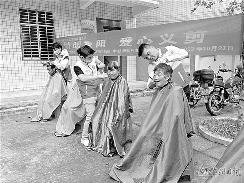 这一幕发生在宁新街道2023年重阳节系列活动上。水楼村村民罗女士由于年纪大了,腿脚不方便,出行困难,半年没理过发,如今最想解决“头”等大事。听到重阳节村里为老人提供爱心义剪,罗女士赶忙叫上儿媳,搀扶着自己前来理发。