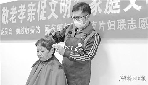 过程中,志愿者还拿出了随身携带的理发工具,用剪刀和梳子为老人们解决“头顶大事”。一把理发剪、一个电推子、一把梳子、一张围布,剪刀上下翻飞,已剪好头发,感觉清爽许多的老人对志愿者连声道谢,夸赞其手艺好、有爱心。