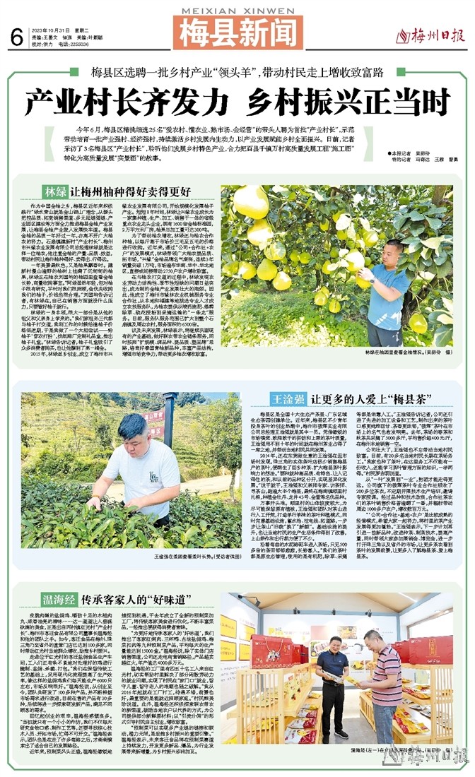 今年6月,梅县区精挑细选25名“爱农村、懂农业、熟市场、会经营”的带头人聘为首批“产业村长”,示范带动培育一批产业强村、经济强村,持续激活乡村发展内生动力,以产业发展赋能乡村全面振兴。日前,记者采访了3名梅县区“产业村长”,聆听他们发展乡村特色产业,合力把百县千镇万村高质量发展工程“施工图”转化为高质量发展“实景图”的故事。