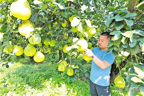 一年美景最秋色,又是柚果飘香时。建新村漫山遍野的柚树上挂满了沉甸甸的柚果,林绿正在柚农刘国均的柚园里查看金柚长势,商量收购事宜。“阿绿虽然年轻,但对柚子很有研究,平时对我们很照顾,会优先收购我们的柚子,价钱也很合理。”刘国均告诉记者,有林绿在,自己在销售方面就没什么压力,只要管好柚子就行。