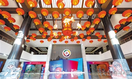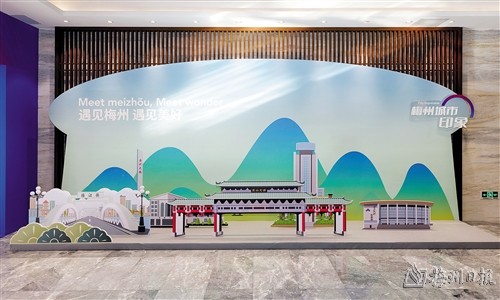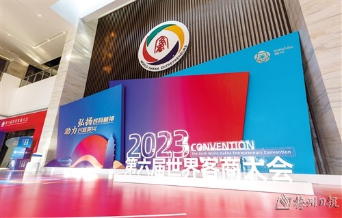 在大会主会场世界客商中心门口,只见彩旗飘扬、灯笼高悬。入口处,一个新搭建的蓝色大门格外引人注目,上面写着“第六届世界客商大会”,门框上还标注着本届大会的主题“弘扬客商精神 助力民族复兴”,显得庄重热烈。走进大厅布展现场,本报记者发现不少富含客家元素的展板,展板上除了写有“遇见梅州 遇见美好”等标语外,还通过立体图案的方式将广东汉剧、梅州客家山歌等非物质文化遗产和梅江桥、东山大桥、广州大桥等城市地标展示出来。