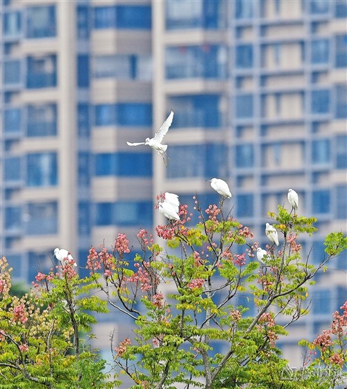 除了湾下村,记者还在梅城剑英公园内看到,成群白鹭栖息其中,吸引众多市民前来观鸟和拍照。“树上白茫茫的那一片,都是在栖息的白鹭,数量比往年多了不少。”居住在剑英公园附近的市民张先生告诉记者。