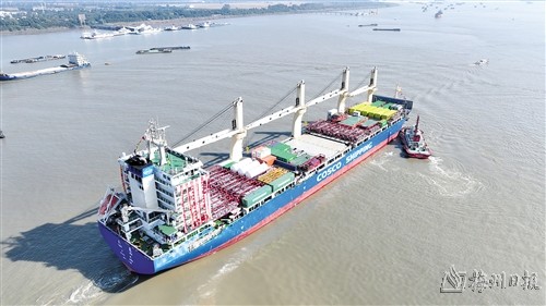 图为“天惠”轮货船驶离张家港港。(新华社发)