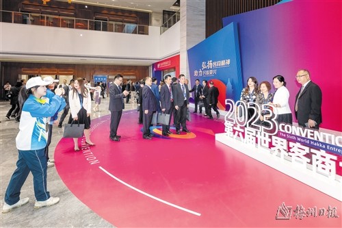 本报讯 (记者林德培)“来来来,请帮我们拍一张”“来梅州参会,一定要留影”……11月3日下午,在嘉应论坛开始前,参加第六届世界客商大会的嘉宾纷纷在世界客商中心大厅互相交流、合影留念。