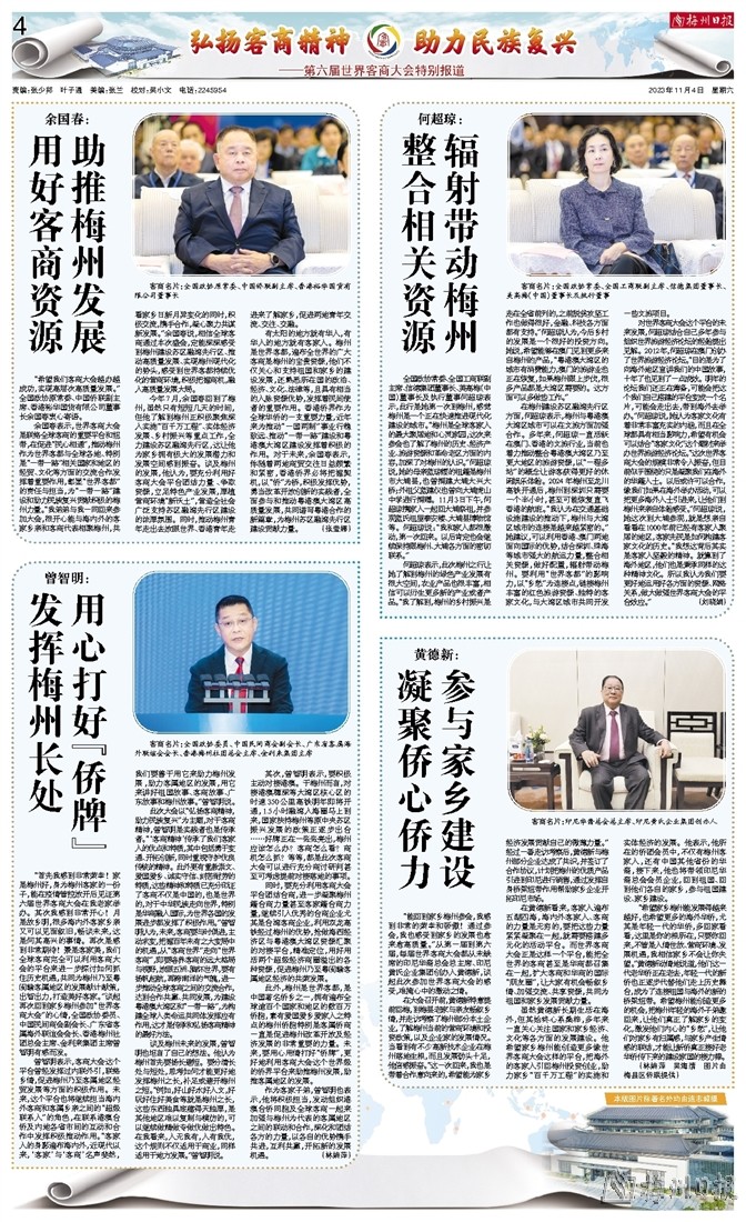 全国政协常委、全国工商联副主席、信德集团董事长、美高梅(中国)董事长及执行董事何超琼表示,此行是她第一次到梅州,感觉梅州是一个正在快速推进现代化建设的城市。“梅州是全球客家人的最大聚居地和心灵家园,这次来参会也了解了梅州的历史、经济产业、旅游资源和革命老区方面的内容,加深了对梅州的认识。”何超琼说,她的母亲蓝琼缨的祖籍是梅州市大埔县,也曾捐建大埔大兴大桥;外祖父蓝建仪也曾向大埔虎山中学进行捐赠。11月3日下午,何超琼携家人一起回大埔祭祖,并参观蓝氏祖屋泰安楼、大埔县博物馆等。何超琼说:“我和家人都很激动,第一次回来。以后肯定也会继续保持跟梅州、大埔各方面的密切联系。”