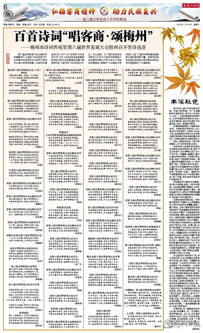 第六届世界客商大会在梅州市的隆重举行,让身处“中华诗词之市”中的梅州市诗词学会全体同仁感到无比高兴和深受鼓舞。自我市创建诗词之市,并于2015年荣获“中华诗词之市”以来,市诗词学会紧紧围绕我市经济和社会发展事业的重大事项鼓与呼,不断夯实“中华诗词之市”这一文化品牌。为了更好地发挥诗词界在文化艺术方面对世界客商大会的宣传和推介作用,他们以“百首诗词唱客商·颂梅州”为主题进行诗词创作,在扩大宣传效果和擦亮品牌等方面积极贡献力量。现将市诗词学会组织我市部分诗词爱好者和会员作品登载如下,以飨读者。