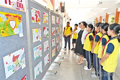 “同学们,你们知道这个穿白色衣服的什么兵吗?”“8月1日是什么节?”……在友邦小学一楼教学楼的主题书画展前,该校校长汤喜梅通过主题书画中呈现的国防元素,向学生们传授国防知识。“学校一直将国防教育融入教育教学过程中。”汤喜梅说,依据学生的发展阶段和思想实际,确立不同的层次和重点,采取灵活多样的教育形式,开展蕴含国防教育的各种有益活动。