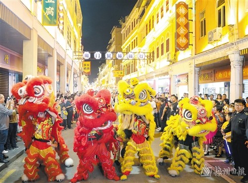 11月3日晚,梅江区举行晚宴,欢迎来自海内外的客商回“嘉”,共叙乡情、共商未来、共襄盛举。此外,“逛古城、赏非遗、品美食”梅江区嘉应古城美食节及非遗文艺演出也在当晚启动。在嘉应古城街道两旁,新挂上的招牌亮起灯光,沿街的客家非遗美食吸引众多游客驻足。伴随着激扬磅礴的锣鼓声,醒狮跃地而起,抖擞身躯、随风舞乐,向大众展示非物质文化遗产的魅力,传承和弘扬优秀传统文化。“我们从来没见过老街有那么热闹的场景,新挂的招牌很有特色,给人眼前一亮的感觉。”嘉应学院学生徐子珊、朱湘燕向记者说道。