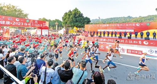 本报讯 (记者朱庆强)11月5日,东山健康·2023梅州马拉松赛在梅县区人民广场开跑。来自全球12个国家和地区的近2万名选手齐聚梅州,用快乐的脚步丈量梅州,用拥抱的姿态感受世界客都的魅力。