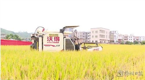 横陂镇水稻绿色高产高效创建示范基地位于联长村,辐射带动红光村、崇文村共计1000亩。在基地里,一望无际的金色田野上,收割机正在稻田间穿行,隆隆作响,饱满的稻穗随风而动,阵阵飘香,正是一幅丰收的美好景象。