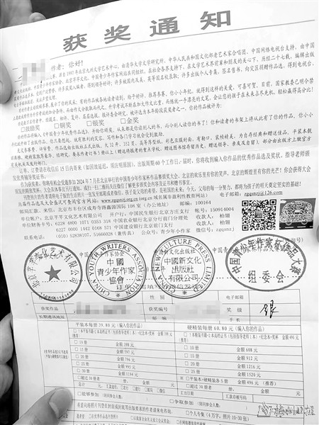 小玲的情况并非个例。近段时间,陆续有学生家长和老师向本报反映遇到了相同情况。记者从家长和老师提供的信件中看到,该获奖通知称“学生作品获得中国青少年作家杯作品大赛银奖,作品将编入《中国青少年优秀作品选》,并进行颁奖”。此外,该通知还声称免交参赛费、评审费,要求作者订书5册以上,其中平装本每册39.8元,硬精装每册60.8元,订单、订费要在收信后15日内寄到,同时附有汇款账号等信息。
