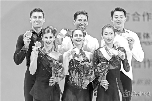 11月11日,冠军加拿大组合斯特拉托-杜迪克(前中)/德尚(后中)、亚军意大利组合吉拉尔迪(前左)/安布罗西尼(后左)、季军中国组合彭程(前右)/王磊在双人滑颁奖仪式上。